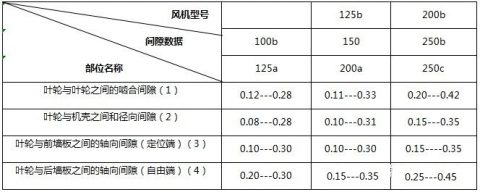 裝配間隙系20℃時的理論靜態(tài)間隙值。其能保證在額定工況下滿足動態(tài)時所需之工作間隙。為此,裝配間隙乃是保證風(fēng)機(jī)性能和安全運(yùn)用的重要因素。每臺羅茨風(fēng)機(jī)出廠時,皆已對裝配間隙進(jìn)行調(diào)整,用戶不得隨意變動。具體間隙值見下表: